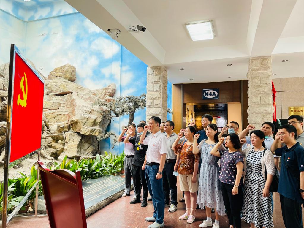随后,全体党员走进茅山新四军纪念馆,通过馆内“抗击日寇,八省健儿汇铁流”、“挺进江南,开辟苏南根据地”、“战略展开,挥戈东进再北上”、“重创日伪,建设苏南根据地”和“收复失地,苏南军民迎胜利”五个部分开展了党史学习教育。党员同志们认真观看了展厅展出的新四军战斗旧照、曾使用过的武器,以及其他史实照片和实物史料。大家纷纷被新四军的铁军精神所感染,被烈士们视死如归、豪情壮志的革命气概所鼓舞。最后,全体党员在党支部书记宋威老师的带领下,面对党旗庄严宣誓,重温了入党誓词。