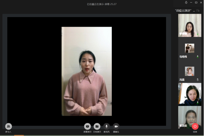 主办的战“疫”云演讲比赛正式线上举行。学院党委副书记副院长陈祎,学院辅导员沈丹、王牧以及班主任老师蒋亦樟、詹千熠、范超、潘祥和学院学生代表50余人共同出席本次活动。