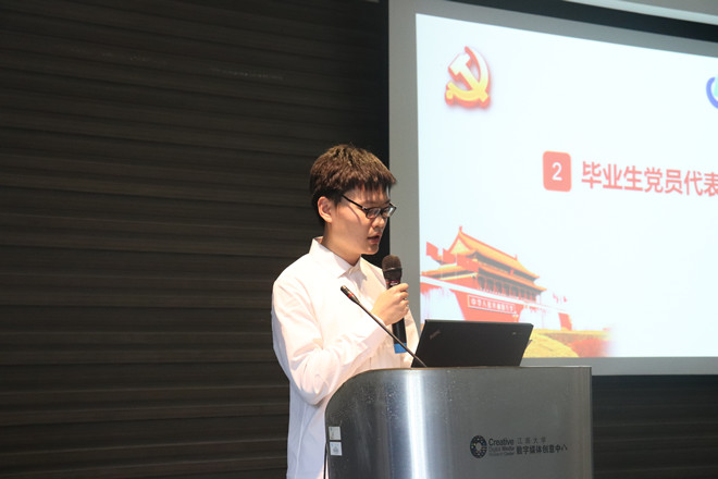 紧接着计算机本科第一党支部党支部书记张海旭代表毕业生党员发言,他回顾了自己的入党经历以及分享了身为一名学生党员的感悟,表示将时刻牢记自己的党员身份,踏实勤奋,始终保持着先进性。