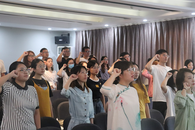 在重温入党誓词环节,全体与会党员庄严地举起右手,紧握成拳,在党委副书记陈祎的带领下,对入党誓词进行了重温,一句句誓词铿锵有力,掷地有声,饱含着大家对党的忠诚和信念,以及对党的承诺。