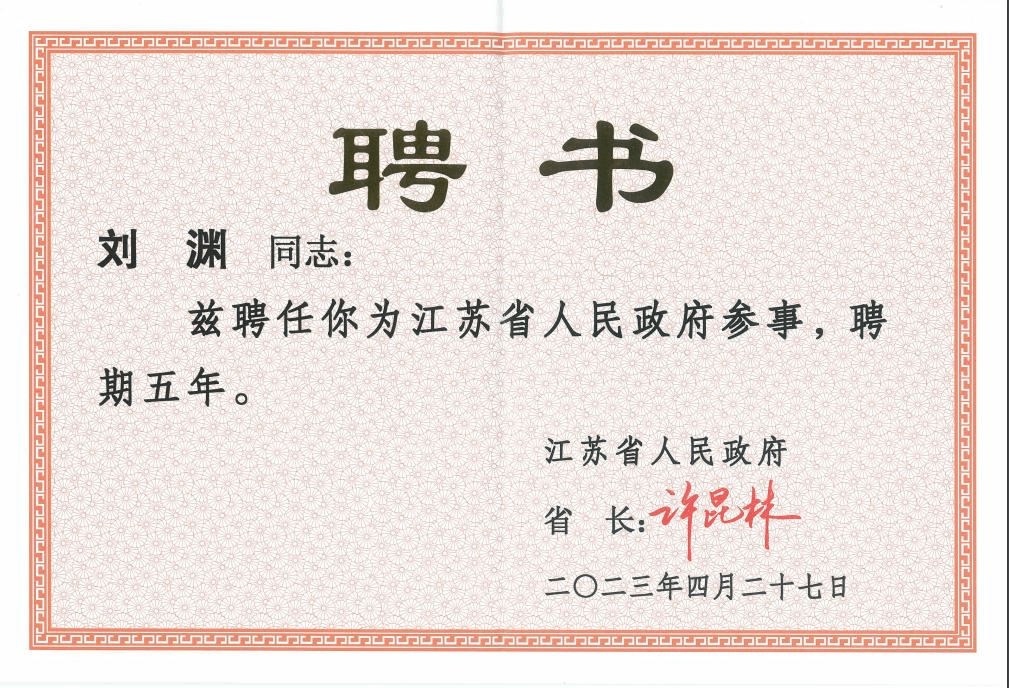 新澳门六合彩论坛 刘渊教授受聘为江苏省政府参事