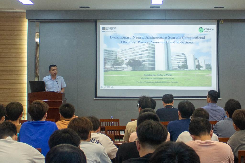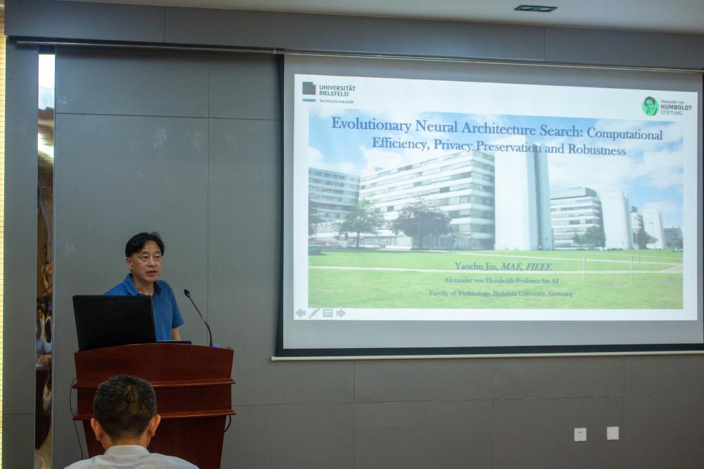 7月20日下午,欧洲科学院院士、IEEE Fellow,德国比勒菲尔德大学工程学院“洪堡人工智能教席教授”金耀初应邀,来校为新澳门六合彩论坛 师生作《Multi-objective evolutionary neural architecture search: Communication efficiency, privacy preservation, and adversarial robustness》主题讲座,讲座由学院副院长谢振平主持,副院长钱鹏江、宋威,教师代表王士同等70余名师生参加。