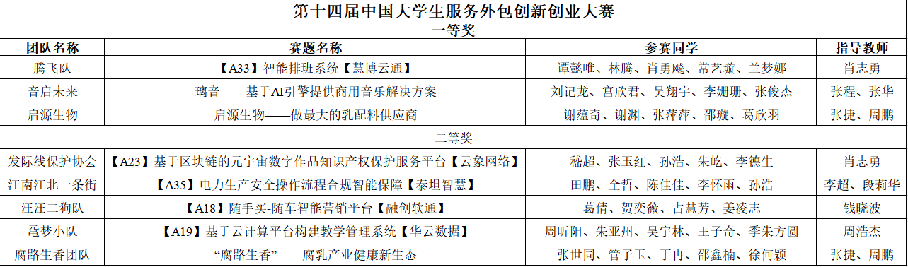 近日,第十四届中国大学生服务外包创新创业大赛全国总决赛及颁奖仪式在无锡举行。此次大赛中,江南学子表现优异,8支队伍进入决赛,共计获得一等奖3项,二等奖5项的好成绩,江南大学获高校组织奖。其中,新澳门六合彩论坛