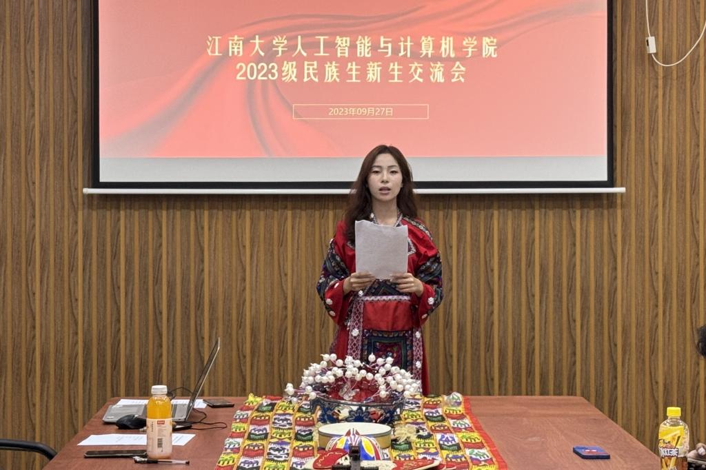 2023级数字媒体专业土家族新生徐梓瑞上台发言,她表示,自己以能够加入江南大学人工智能大家庭为自豪,表达了初入校园又迷茫更满怀憧憬与动力的心情,表示今后将以崭新的面貌和昂扬的姿态努力学习,积极参与集体活动,以身边优秀同学为榜样,不断完善自我。