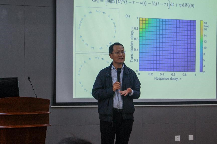 孙永征教授介绍了多智能体网络群集动力学的研究现状、研究意义、面临的挑战以及应用方向。在过去的研究中发现,只有当噪声强度足够小时,多智能体系统才能出现有序的群集运动,这表明噪声会破坏有序的群集运动。然而,近来的研究表明,噪声也可能会增强网络系统的群集行为。他以蝗虫群体研究为例,介绍了团队在长时间的深入探索取得的实验结果:渐近一致性、有限时间一致性、Cucker-Smale系统的蜂拥行为以及蝗虫群体方向切换行为。随后,他分享了其在牛津大学访学时研究蝗虫的有趣见闻,让同学们见识了学术科创实验的趣味性。