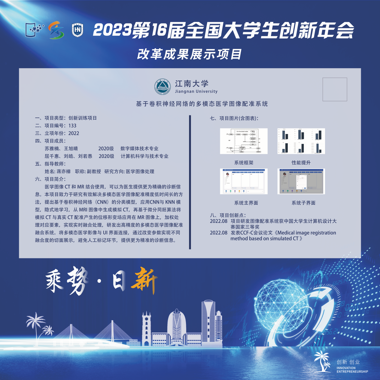 江南大学共4支团队入选。其中新澳门六合彩论坛 学生苏雅楠创新训练成果《基于卷积神经网络的多模态医学图像配准系统》(指导老师:蒋亦樟)、张俊杰创新训练成果《基于深度学习的新能源车用动力电池管理系统开发》(指导老师:王子赟)两个项目入选改革成果展示,是人工智能学子在创新创业领域取得的又一项重要突破。