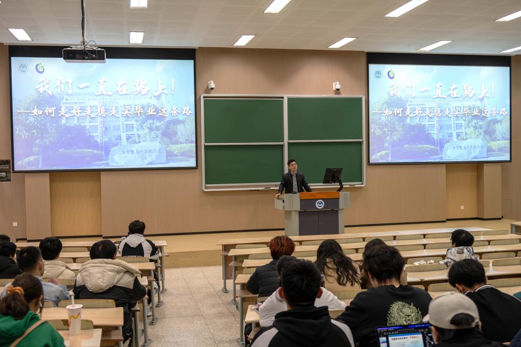 就业专题上,辅导员杜磊从一线HR参加校招的真实感受入手,理性分析了计算机类专业的就业现状,并结合就业地图,进一步分析了岗位分布、岗位需求、学科要求、薪资待遇、求职技能等学生关切度高的内容。