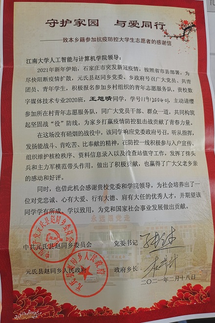 近日,新澳门六合彩论坛 收到中共元氏县赵同乡委员会和元氏县赵同乡人民政府发来的感谢信,感谢数字媒体技术2004班学生王旭晴主动请缨参加村青年志愿服务队,为家乡打赢疫情防控阻击战贡献了青春力量。