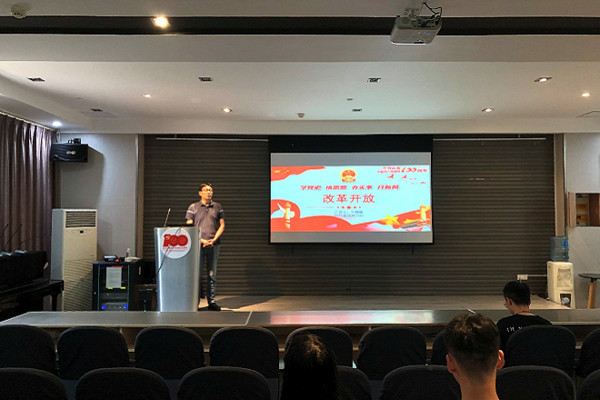 王晓锋老师以历史人物、历史事件为导入,以党的十一届三中全会为起点,带领我们开启了改革开放史的学习。从提出了“建设有中国特色的社会主义”这一重大命题,到确定继续前进的正确道路、战略步骤和方针政策这一壮阔蓝图,再到开创了社会主义现代化建设新局面,最后沿着中国特色社会主义道路继续前进这四个方面来展开。本次党课王晓锋老师不仅引领大家简明扼要的回顾了改革开放史,还给出了关于改革开放的未来思考。中国要向国人、世界表明改革开放的坚定意志决心,要通过新一轮扩大开放来为全球经济化树立“中国榜样”,要勇于打破国际固守保护主义和精致利己主义的“零和思维”战略桎梏,推动构建新型国际关系,构建人类命运共同体。