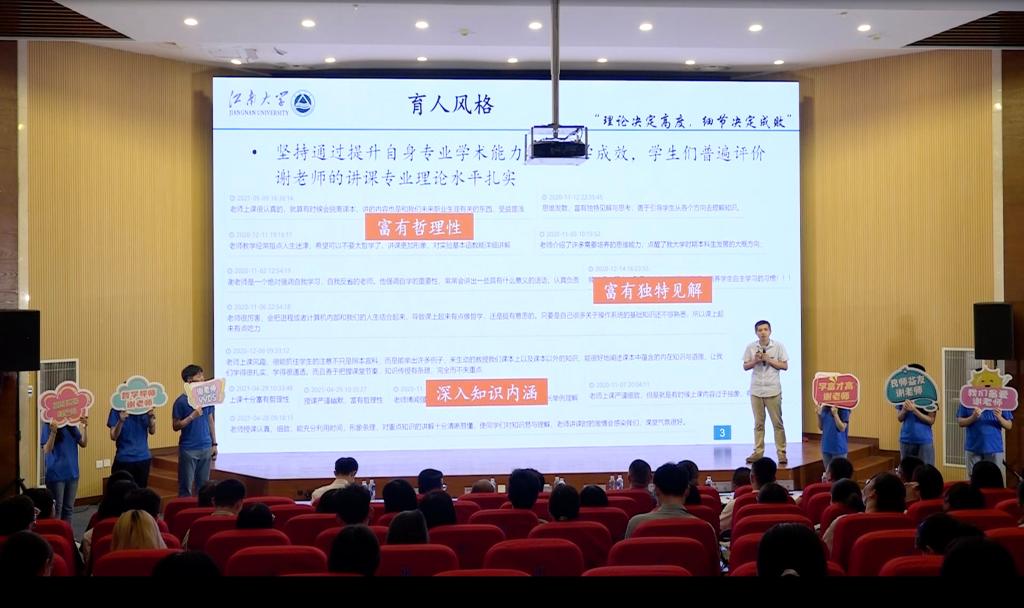 决赛现场,谢振平老师从“在变化中学习,在学习中成长”的个人特色、“理论决定高度,细节决定成败”的育人风格、“勇于理论探索,不忘脚踏实地”的科研创新等方面充分展示了自己“厚德、善创”的教学理念,教学能力以及教学热情。谢振平老师拥有丰富的专业知识,充足的教学经验深受同学们喜爱。他注重培养学生研究性学习的能力,鼓励学生创新思考,以学生为本,亦师亦友。枯燥的代码世界中,他是黑夜指路的明灯;复杂的程序过程里,他是答疑解惑的名师。